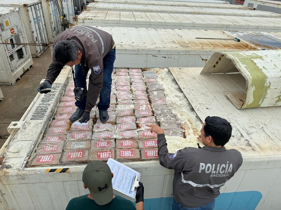 Unos 93 paquetes con envoltura plástica de cinta de diferentes logotipos y leyendas fueron encontrados camuflados en el techo de un contenedor en un puerto de Machala, El Oro.